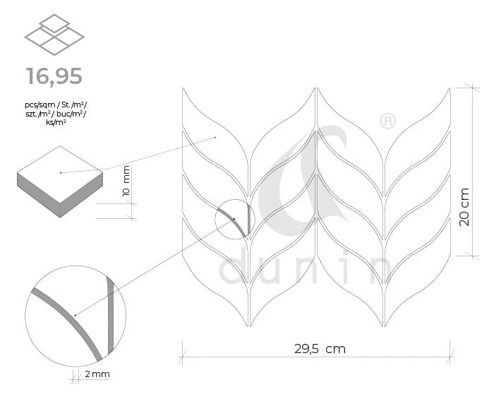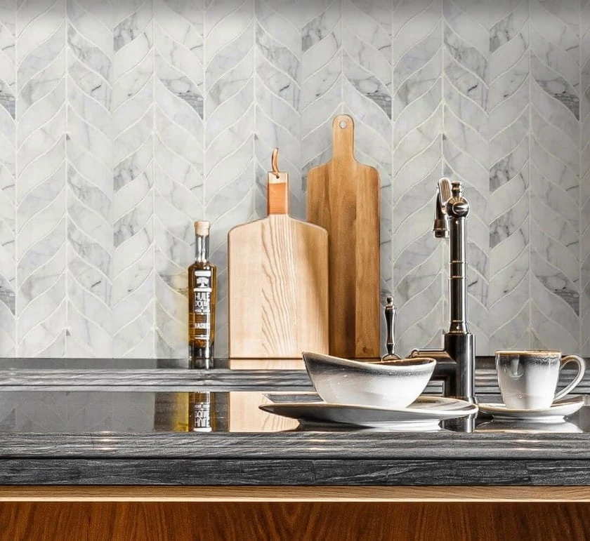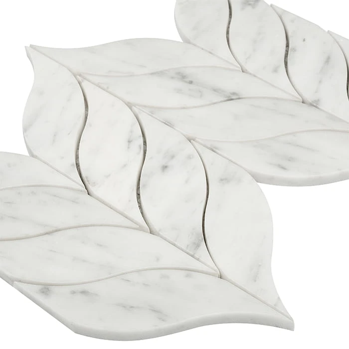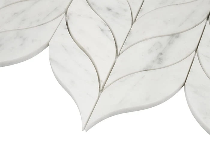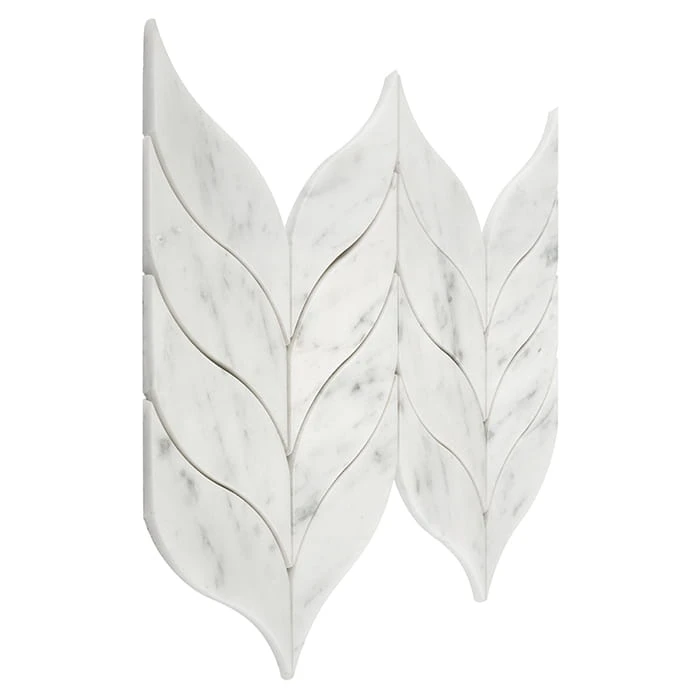 DUNIN Carrara White Calamus to kompozycja w stylu art deco, charakteryzującego się geometrycznymi kształtami, stylizowanymi figurami i luksusowymi materiałami. Płytki są ułożone we wzór przypominający liście. Nieregularne kształty poszczególnych elementów tworzą dynamiczną kompozycję, która ożywi każdą aranżację. Dzięki technice wycinania waterjet, każdy element wyróżnia się dopracowaniem, bez uszczerbienia żadnej z krawędzi.