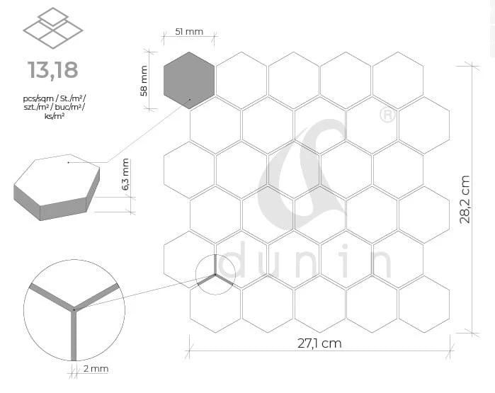 DUNIN Hexagonic to, podobnie jak wiele innych produktów firmy DUNIN, mozaiki gresowe. Ma to niebagatelne znaczenie, gdyż za adekwatną ceną płytek podąża nie mniej atrakcyjna funkcjonalność. Gres zalicza się do materiałów o znacznej wytrzymałości. Nie jest łatwo go uszkodzić czy zarysować. Poza tym dobrze znosi codzienną eksploatację, np. pozostaje odporny na ścieranie. Ponadto, cechuje się niską nasiąkliwością. Pod tym hasłem kryje się niewielka wchłanialność brudu oraz wody. Wszelkie zanieczyszczenia pozostają na wierzchniej części mozaiki, skąd łatwo je usunąć podstawowymi środkami czyszczącymi. Zapraszamy do naszego katalogu, w którym przygotowaliśmy kilkanaście niezwykłych propozycji Hexagonów. W razie potrzeby istnieje też możliwość zamówienia ich próbek.