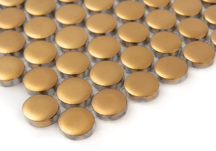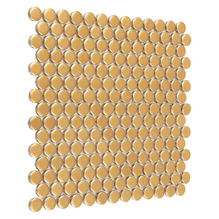 Intrygująca, złota mozaika typu penny w kształcie kółek. Złote płytki pokryte matową glazurą. Doskonale nada się do wnętrz w każdym stylu.