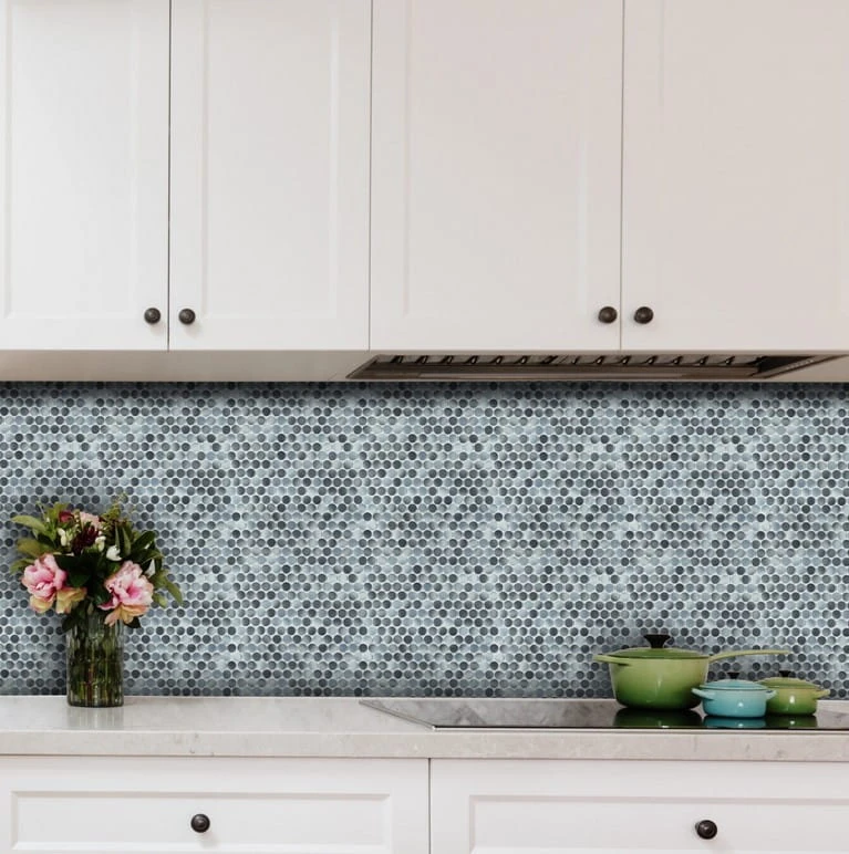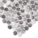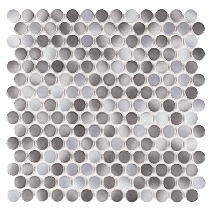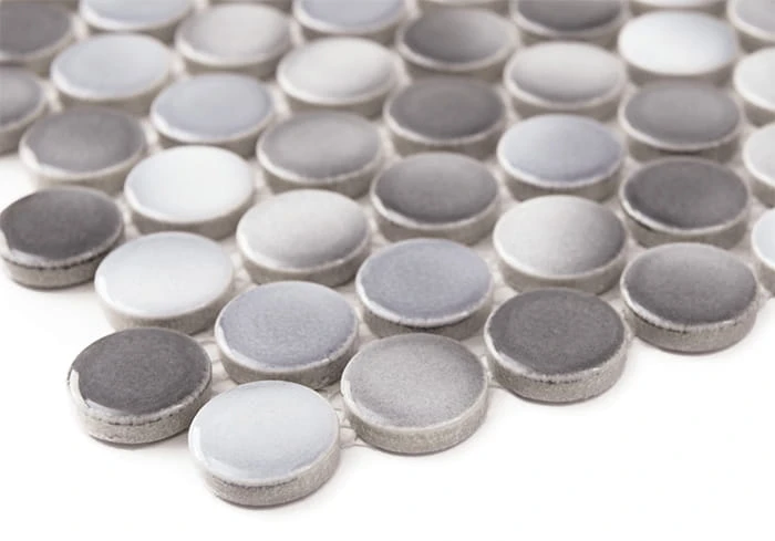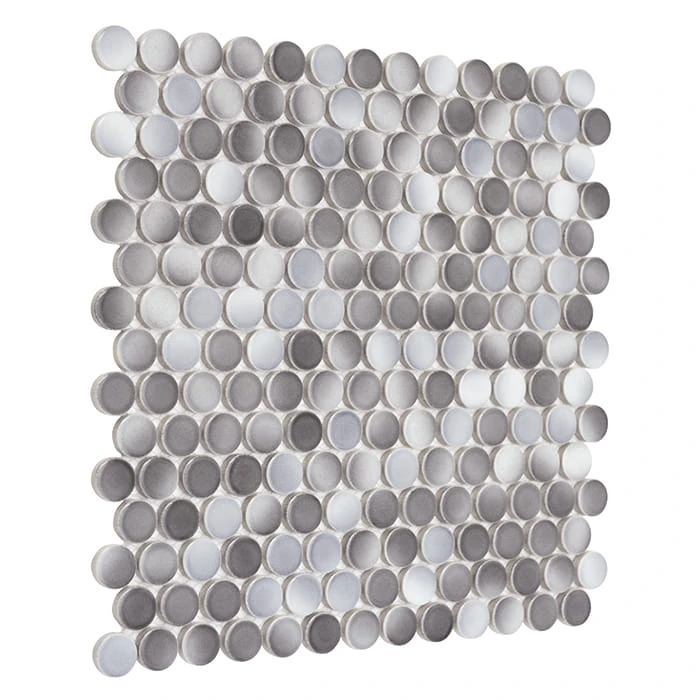 Błyszcząca mozaika typu penny round w kształcie ponadczasowych kółek. Płytki w odcieniach szarości i pokryte fantazyjną, cieniowaną glazurą.