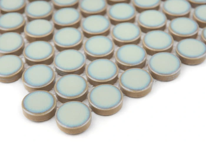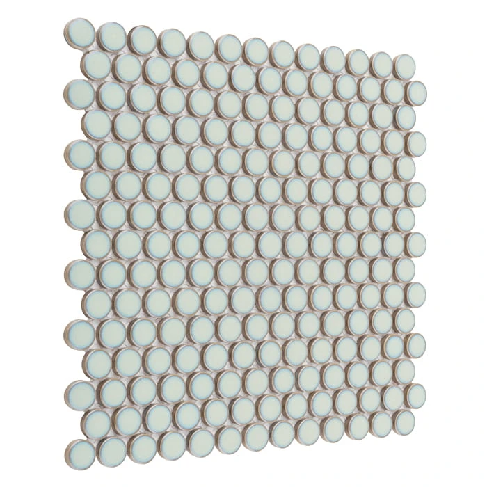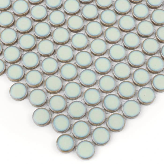 Błyszcząca, miętowa mozaika typu penny w kształcie ponadczasowych kółek. Pokryta cieniowaną glazurą, z efektem przetarcia na brzegach.