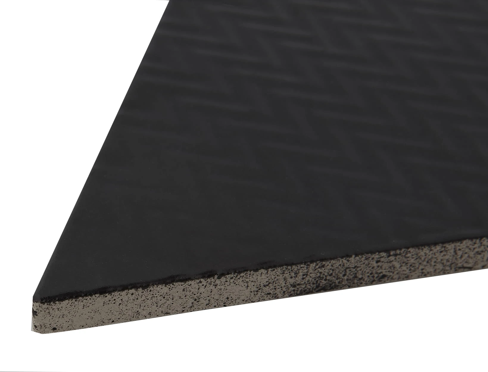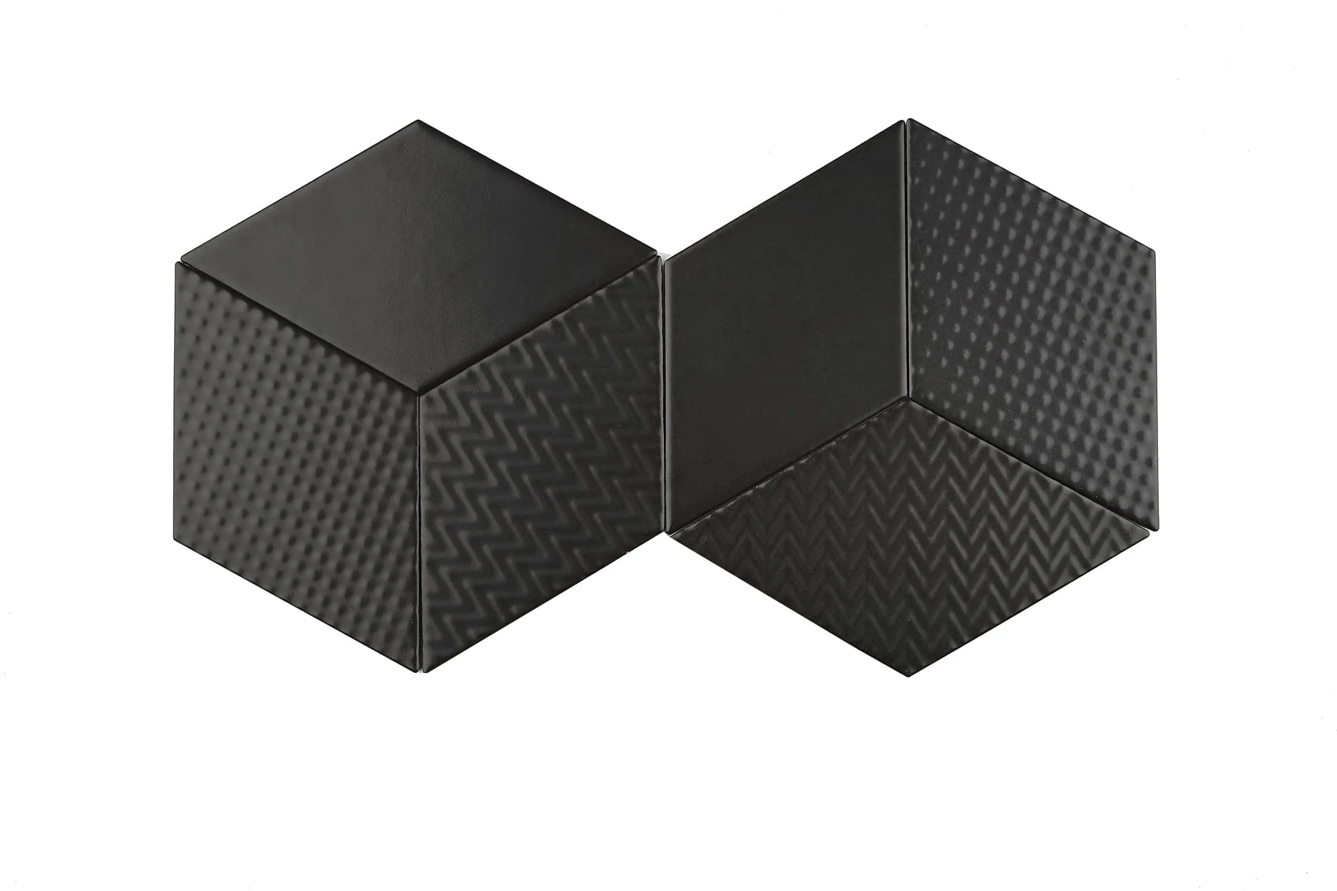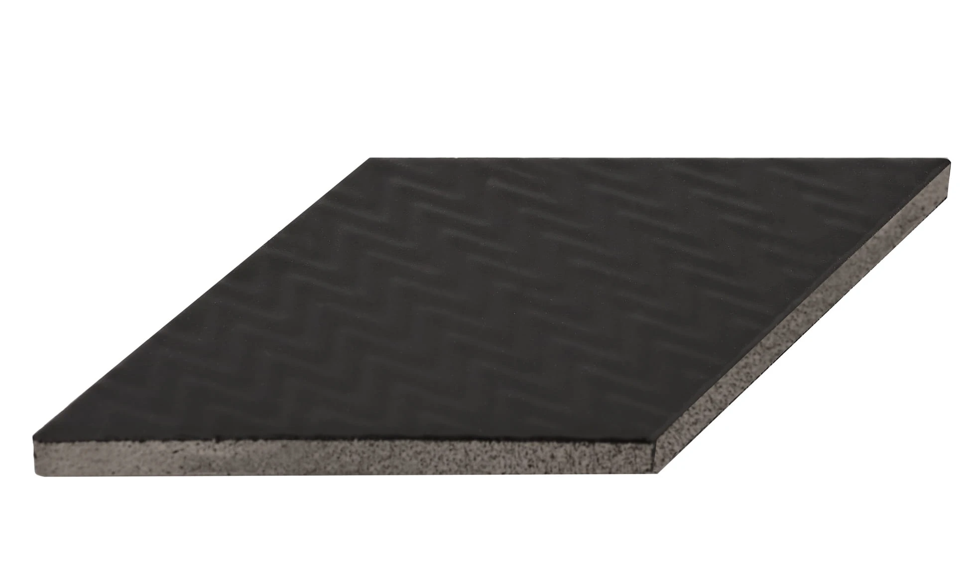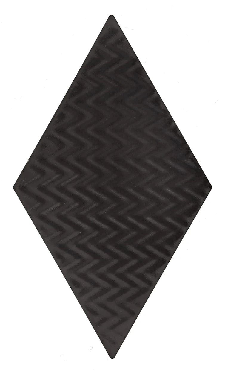 Czarne, matowe płytki ceramiczne w kształcie rombu, które można dowolnie zestawiać z innymi płytkami z kolekcji Rombic, tworząc ciekawe wzory, bawiąc się fakturą.