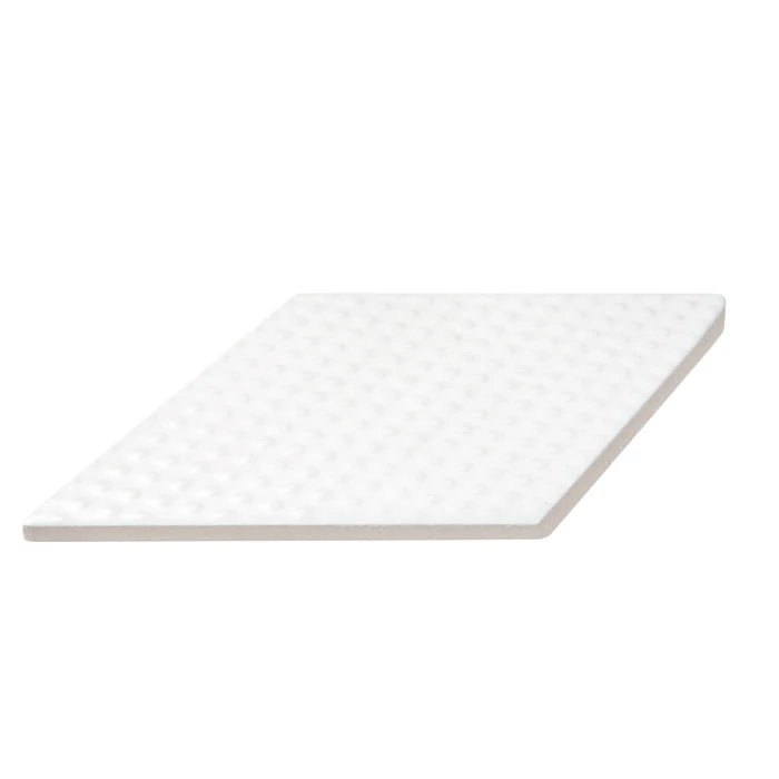 Białe, matowe płytki ceramiczne w kształcie rombu, które można dowolnie zestawiać z innymi płytkami z kolekcji Rombic, tworząc ciekawe wzory, bawiąc się fakturą.