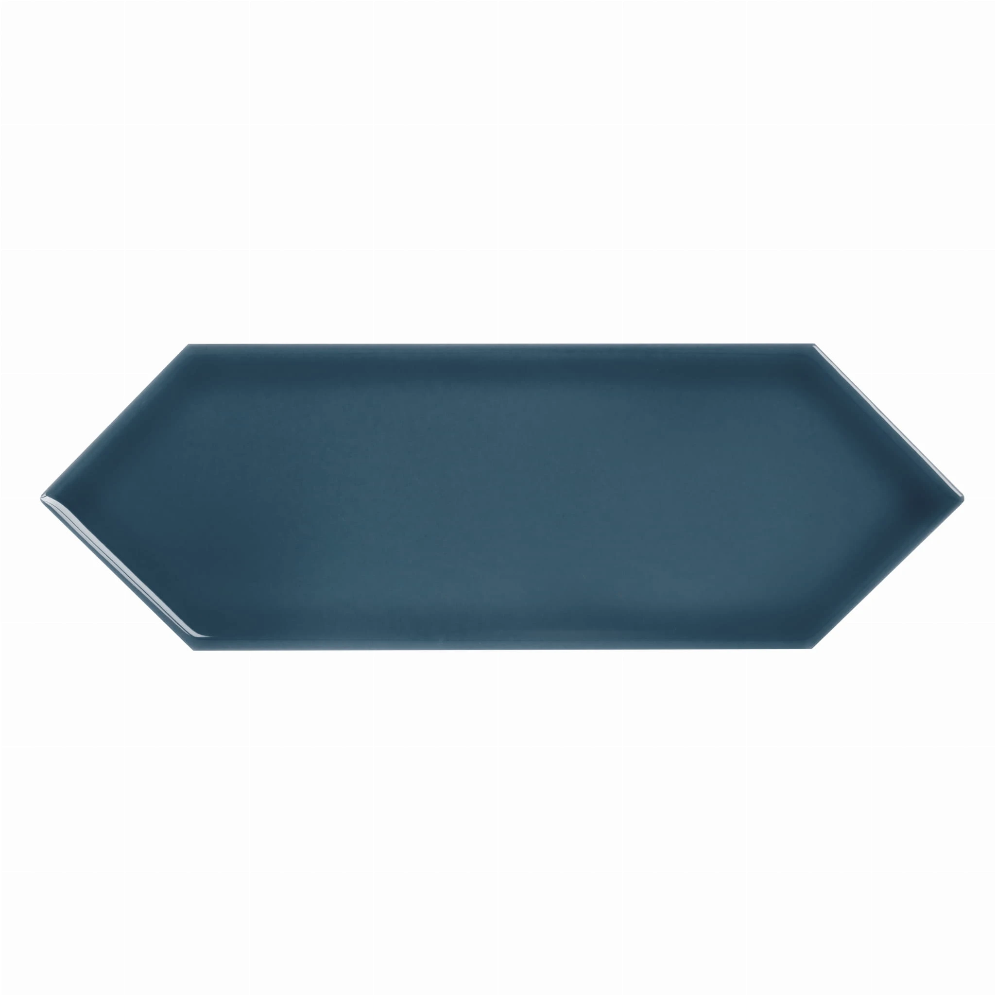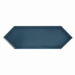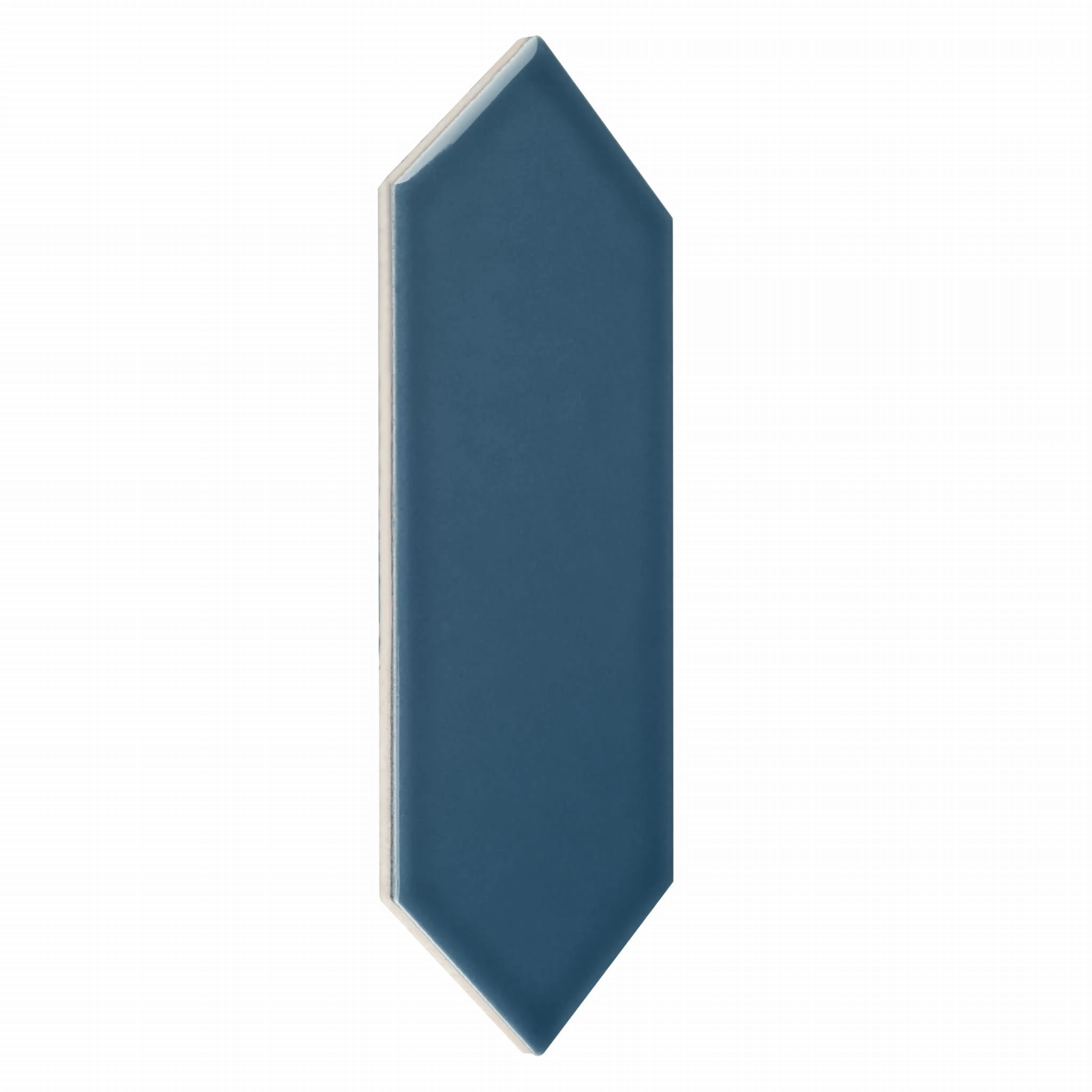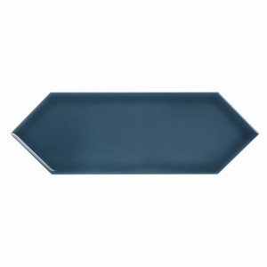 Błyszcząca, niebieska płytka ceramiczna w kształcie przedłużonego heksagonu. Nowoczesny i ponadczasowy design.