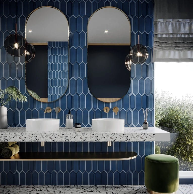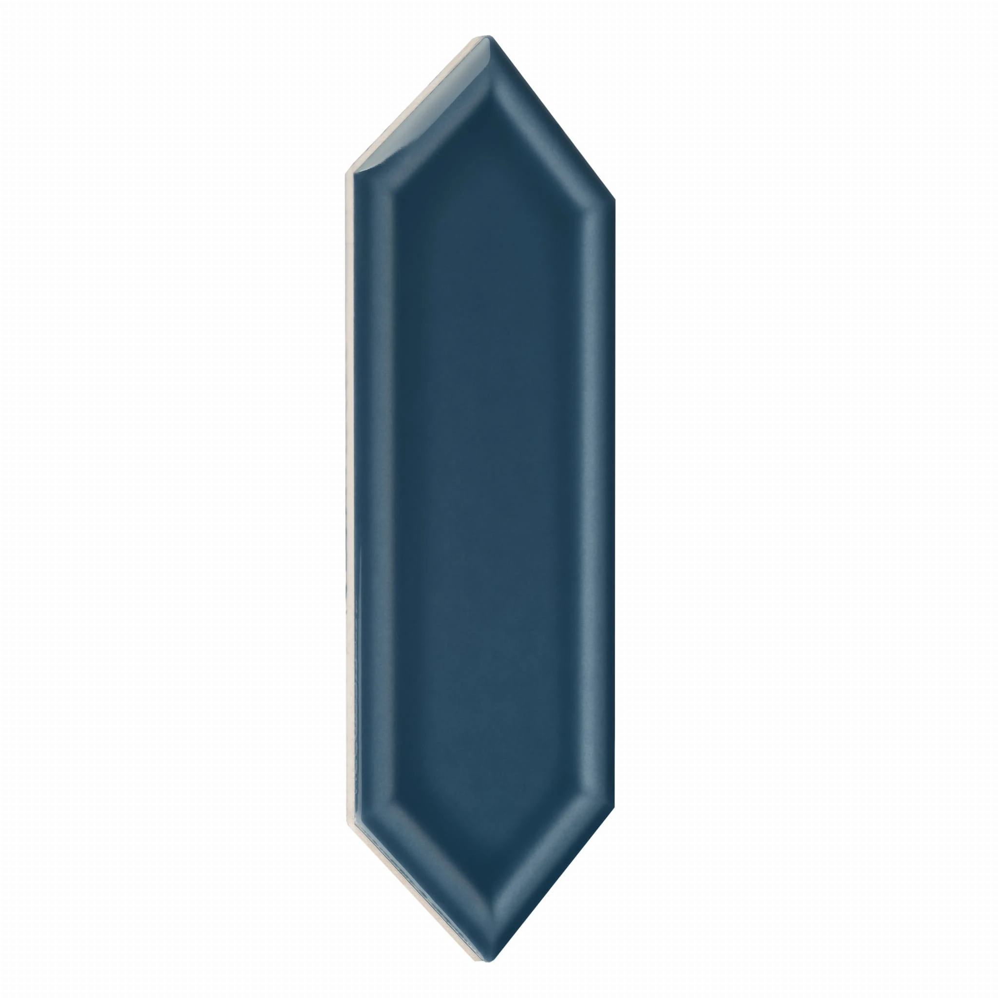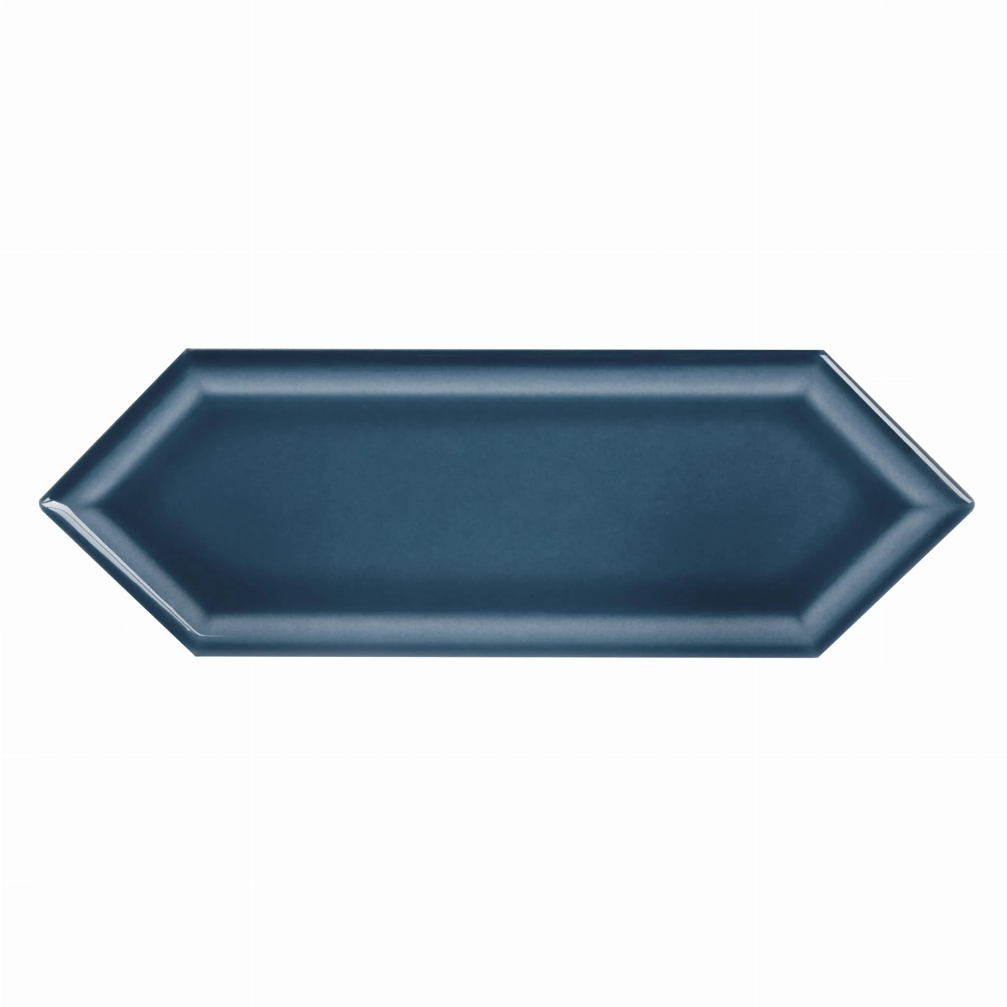 Błyszcząca, niebieska płytka ceramiczna w kształcie przedłużonego heksagonu. Nowoczesny i ponadczasowy design.