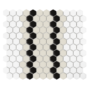 DUNIN Mini Hexagon Stripe 5.1.C matt to połączenie białej bazy oraz szerokiego pasa w kolorze beżu, który został przedzielony podwójną czarną linią, tworząc kompozycje prostokątów. Zestawienie będzie idealnie pasować zarówno na podłodze, jak i ścianach.