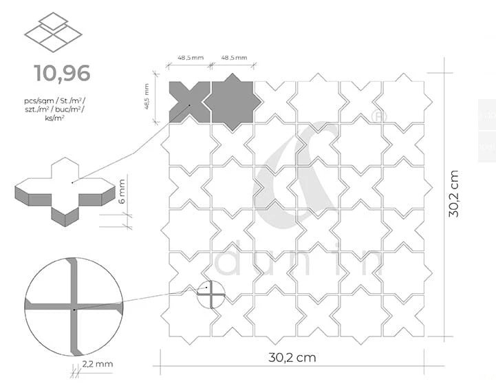 DUNIN Star&Cross Ahs Mix matt to nowa seria mozaik zaprojektowana przez House Loves, charakteryzująca się niebanalnym wzornictwem i minimalistycznym stylem. Design nawiązuje do tradycyjnych, marokańskich wzorów, a sama kompozycja znajdzie idealne zastosowanie zarówno na ścianach jak i podłogach. Ze względu na satynowe wykończenie gresu, wykazuje się wysoką odpornością na zarysowania, a także prostotą utrzymania w czystości.