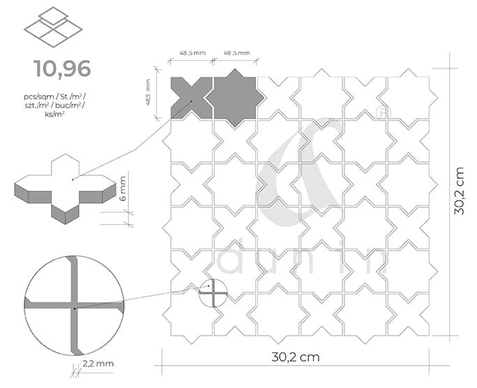 DUNIN Star&Cross Black matt to nowa seria mozaik zaprojektowana przez House Loves, charakteryzująca się niebanalnym wzornictwem i minimalistycznym stylem. Design nawiązuje do tradycyjnych, marokańskich wzorów, a sama kompozycja znajdzie idealne zastosowanie zarówno na ścianach jak i podłogach. Ze względu na satynowe wykończenie gresu, wykazuje się wysoką odpornością na zarysowania, a także prostotą utrzymania w czystości.