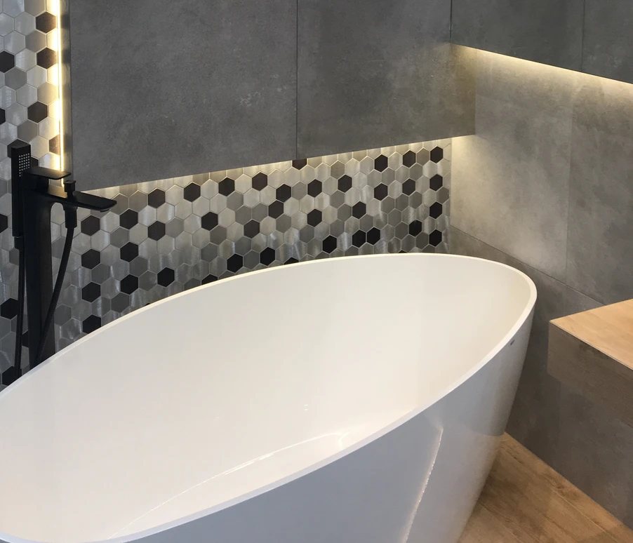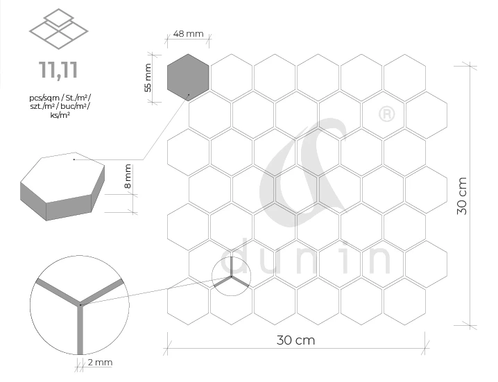 Allumi Grey Hexagon Mix 48 to kompozycja szarych heksagonów, wykonanych z aluminium szczotkowanego w różnych kierunkach. Zastosowana metoda ułożenia na siatce z włókna szklanego, sprawia, że mozaika jest unikatowa, a także idealnie wpasowuje się w przestrzeń kuchenną, nadając jej nowoczesnego charakteru.