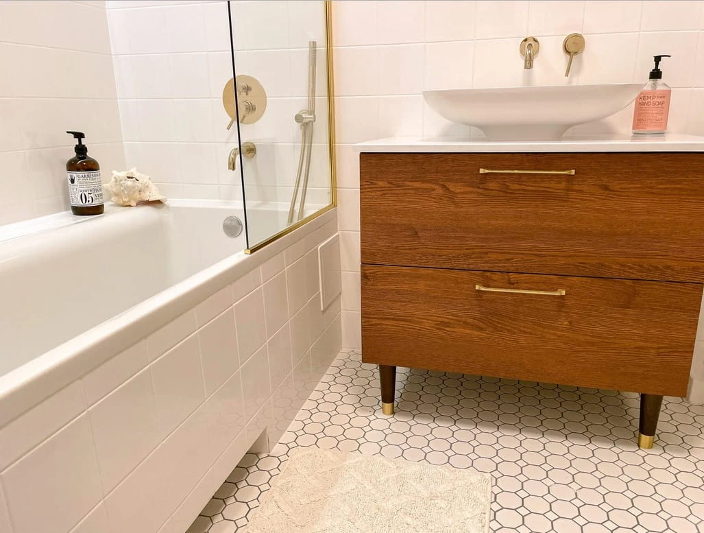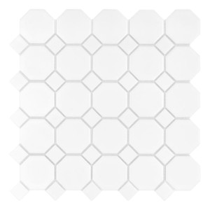 Białe, matowe płytki oktagonalne ułożone na siatce z włókna szklanego w formie mozaiki. Klasyczny wzór, doskonały na podłogi.