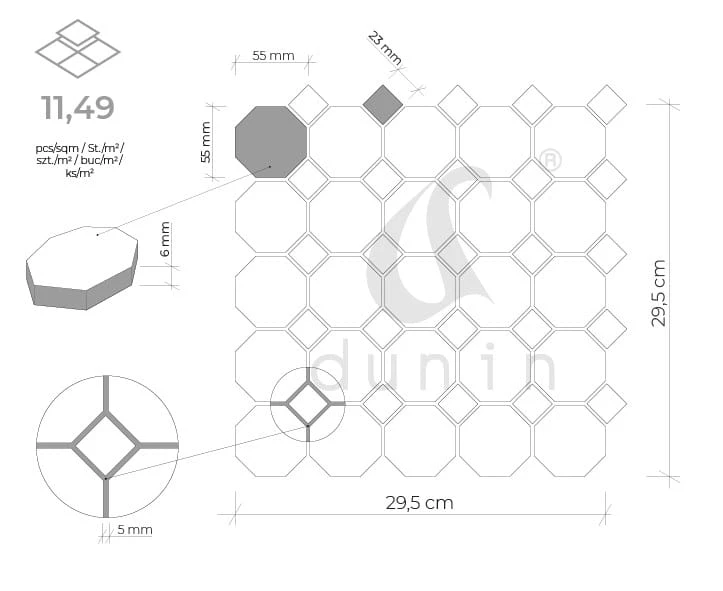 Mozaiki DUNIN ARABESCO stanowią ciekawą alternatywę dla tradycyjnych, kwadratowych płytek. Orientalne marokańskie koniczyny, obłe łuskowe kształty, romby i różnej wielkości oktagony nadają wnętrzom oryginalnego charakteru. Kostki umożliwiają stworzenie niecodziennych kompozycji, zachwycając niepowtarzalnym wzornictwem. Zastosowanie: