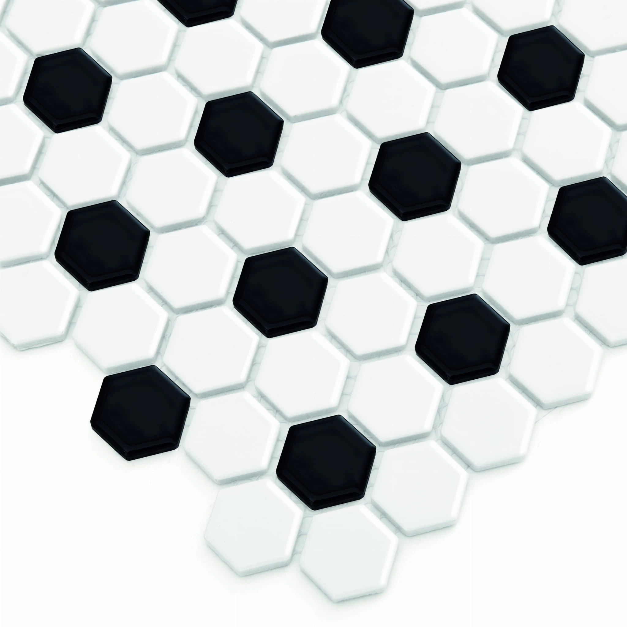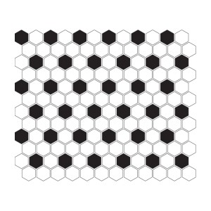Sześciokątna mozaika w kształcie plastra miodu. Heksagonalne, matowe płytki ułożone na siatce z włókna szklanego tworzą biało-czarny, geometryczny wzór nawiązujący do podłóg w nowojorskich kamienicach. Ponadczasowa klasyka.