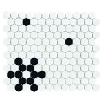 Sześciokątna mozaika w kształcie plastra miodu. Heksagonalne, matowe płytki ułożone na siatce z włókna szklanego tworzą biało-czarny, geometryczny wzór nawiązujący do podłóg w nowojorskich kamienicach. Ponadczasowa klasyka.