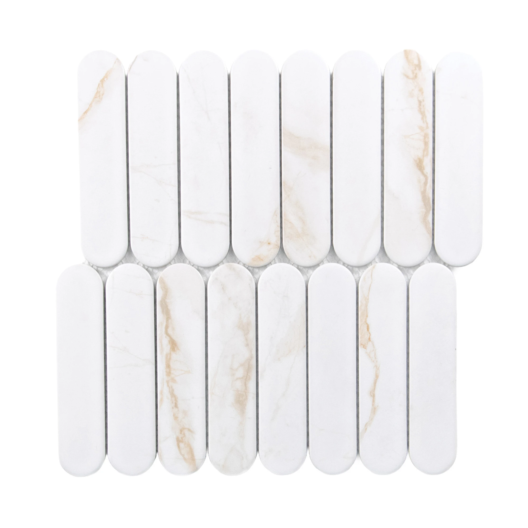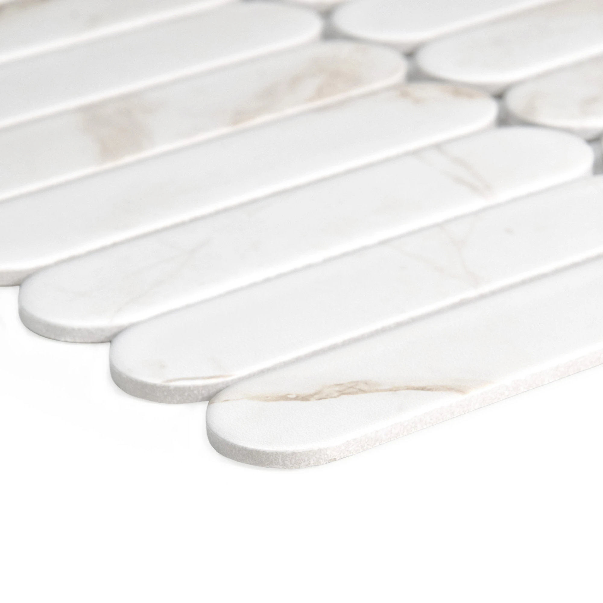 DUNIN Pills Calacatta matt to kwintesencja luksusu w nowoczesnej formie. Inspirowane naturalnym marmurem Calacatta płytki łączą klasyczne piękno kamienia z oryginalnym kształtem wydłużonych biszkoptów. Subtelne złocisto-beżowe żyłkowanie dodaje wnętrzu elegancji i ponadczasowego charakteru, a matowe wykończenie sprawia, że powierzchnia staje się wyrafinowana i delikatna w odbiorze.