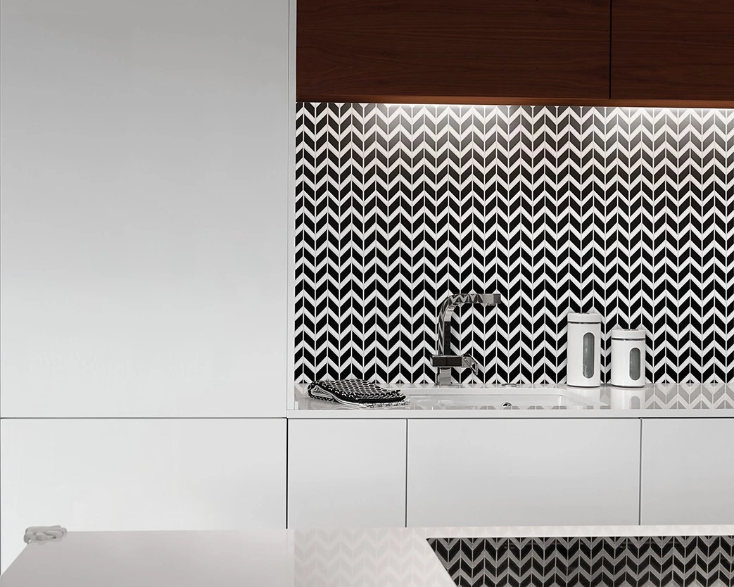 Pure Black Chevron Mix to propozycja z Serii Black & White, wykonana z wysokiej jakości kamienia naturalnego. Przedstawiona kompozycja to zestawienie czarnych, szerokich równoległoboków z węższymi, białymi, które tworzą wzór jodełki francuskiej. Mozaika została ułożona na siatce z włókna szklanego, co pozwala na łatwą aplikację zarówno na podłogi jak i ściany.