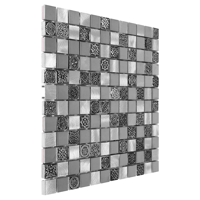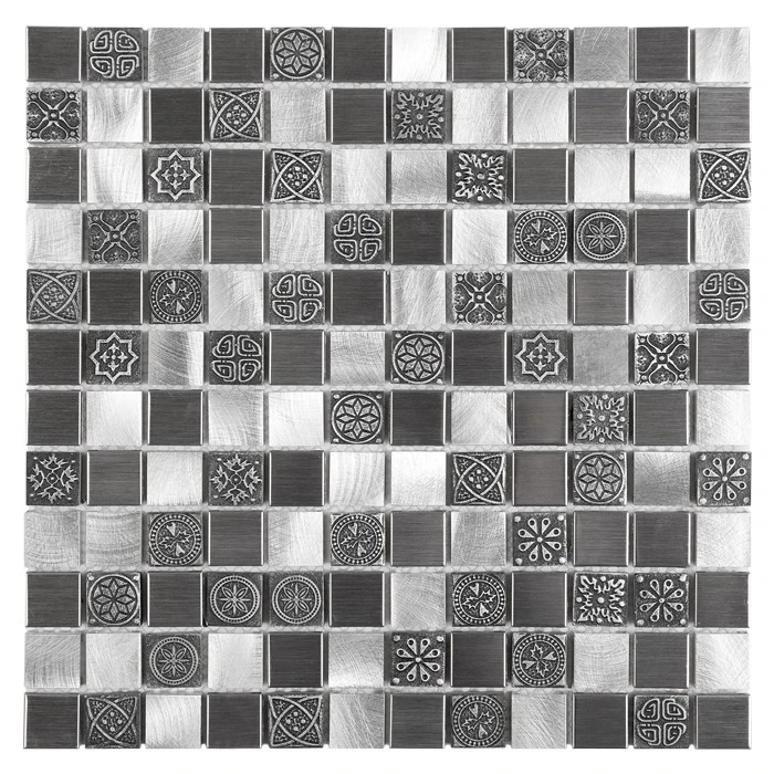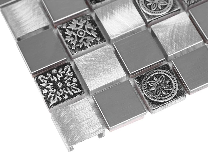 Allumi Grey Mix 23 to kompozycja srebrnych, kwadratów, wykonanych z aluminium szczotkowanego, elementów ze stali nierdzewnej na gresowym rdzeniu, uzupełnione ceramicznymi ornamentami. Mozaika idealnie wpasowuje się w przestrzeń łazienkową, nadając jej nowoczesnego charakteru.