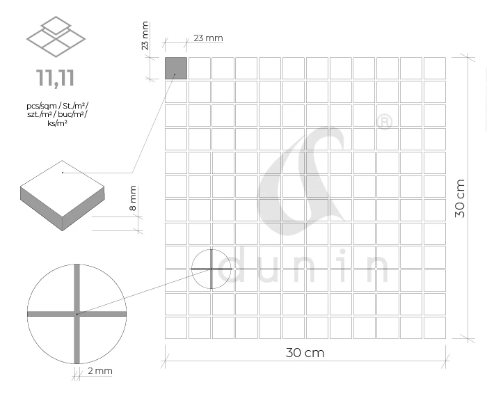 - Łatwa aplikacja ze względu na ułożenie mozaiki na siatce z włókna szklanego.