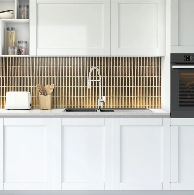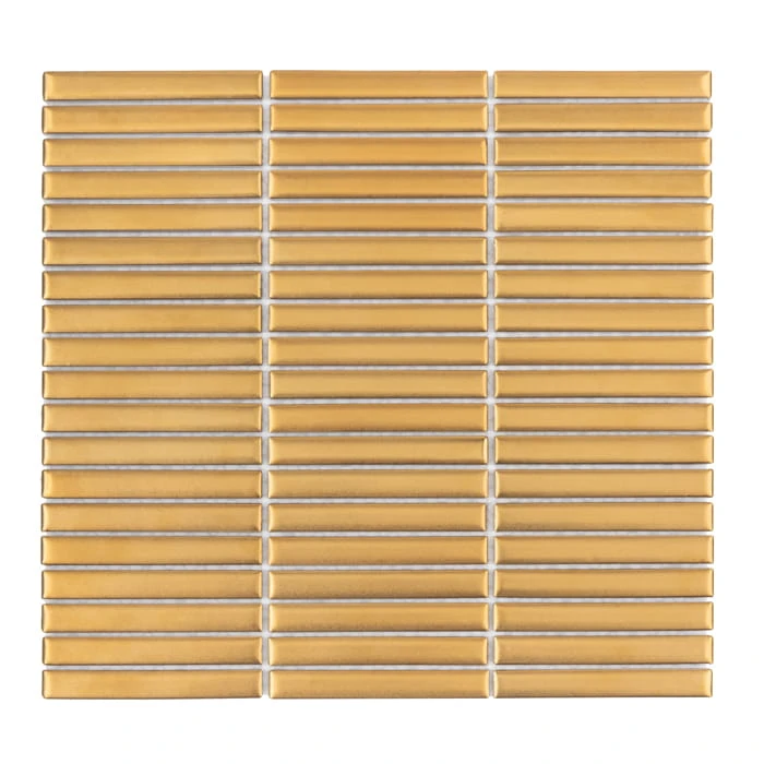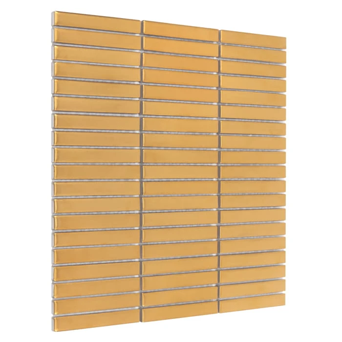 Intrygująca, złota mozaika typu finger, stick w kształcie prostokątów. Złote płytki pokryte matową glazurą. Doskonale nada się do wnętrz w każdym stylu.