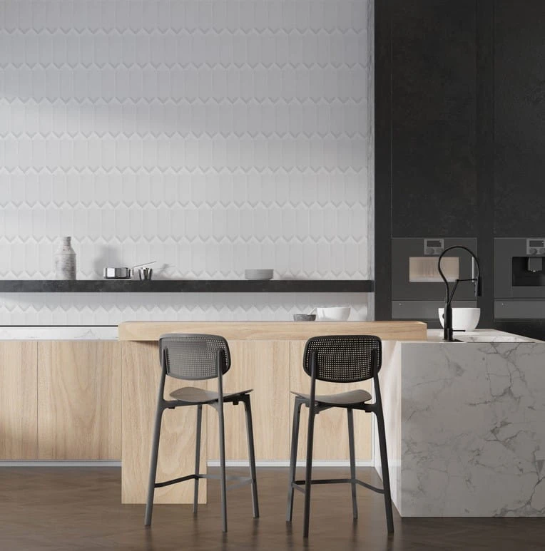 Błyszcząca, biała płytka ceramiczna w kształcie przedłużonego heksagonu. Nowoczesny i ponadczasowy design.