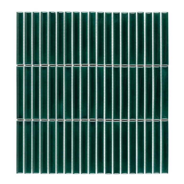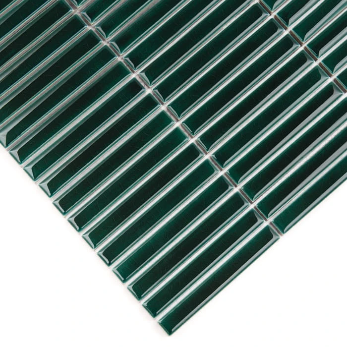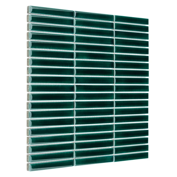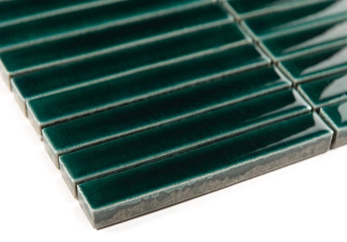 Błyszcząca, zielona mozaika typu finger, stick w kształcie ponadczasowych prostokątów. Pokryta wieloma warstwami glazury, z efektem niewyczuwalnych pod palcami pęknięć nadających głębi.