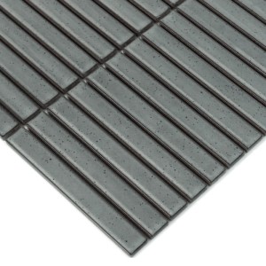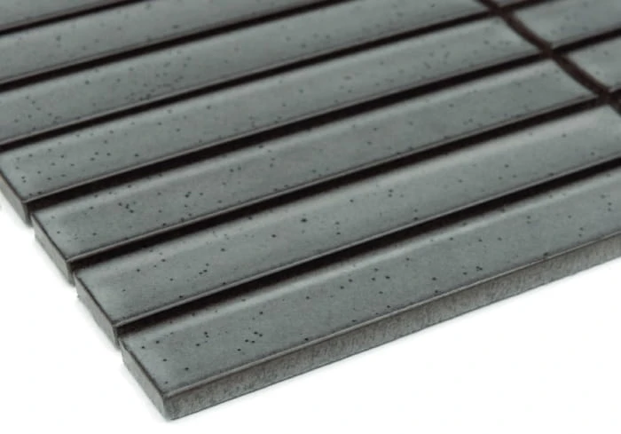 Błyszcząca mozaika typu finger, stick w kolorze nakrapianej szarości. Dzięki wklęsłej powierzchni oryginalnych prostokątów otrzymasz efekt trójwymiarowych ścian.